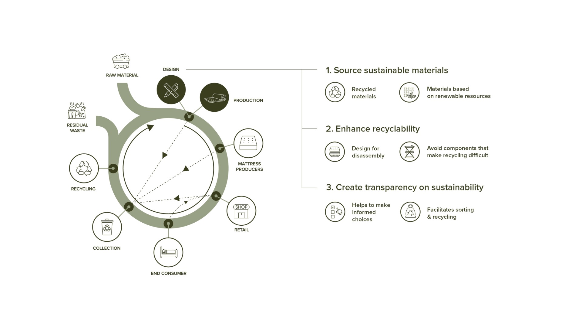 The traditional make-use-waste model is unsustainable, especially as consumption rises. Europeans consume an average of 26 kg of textiles per year, but less than 1% is recycled into new products. The company is committed to driving the shift toward a circular economy. “Using recycled or renewable materials and creating fully recyclable products come with challenges,” explains Ruben Puype. “There’s a lack of mattress collection and sorting facilities, complex textile compositions, and the need for high-purity feedstock. Additionally, Europe has lost much of its yarn production capacity, which now largely comes from Asia.” Ruben emphasizes that brands and retailers play a critical role by leading mattress design and promoting eco-design principles. “Collaboration is essential to achieving a circular economy,” he adds.